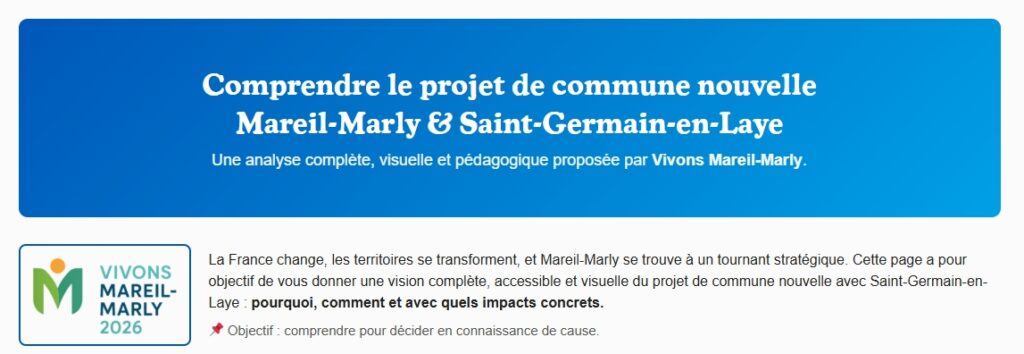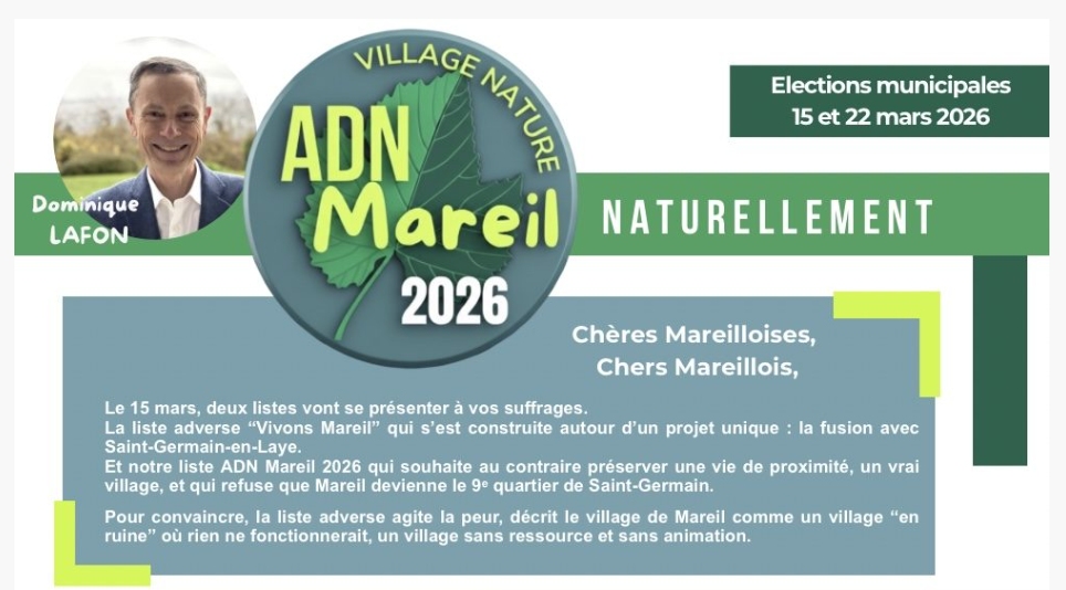 ► La liste Vivons Mareil-Marly 2026 emmenée par Guillaume BESSETTE qui fait, au contraire, du rapprochement avec Saint-Germain-en-Laye une nécessité prioritaire.